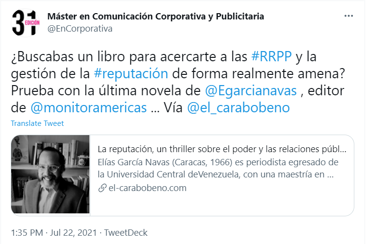 “¿Buscabas un libro para acercarte a las #RRPP y la gestión de la #reputación de forma realmente amena? Prueba con la última novela de @Egarcianavas , editor de @monitoramericas”, refiere un tuit del Máster en Comunicación Corporativa y Publicitaria, de la prestigiosa Universidad Complutense de Madrid.